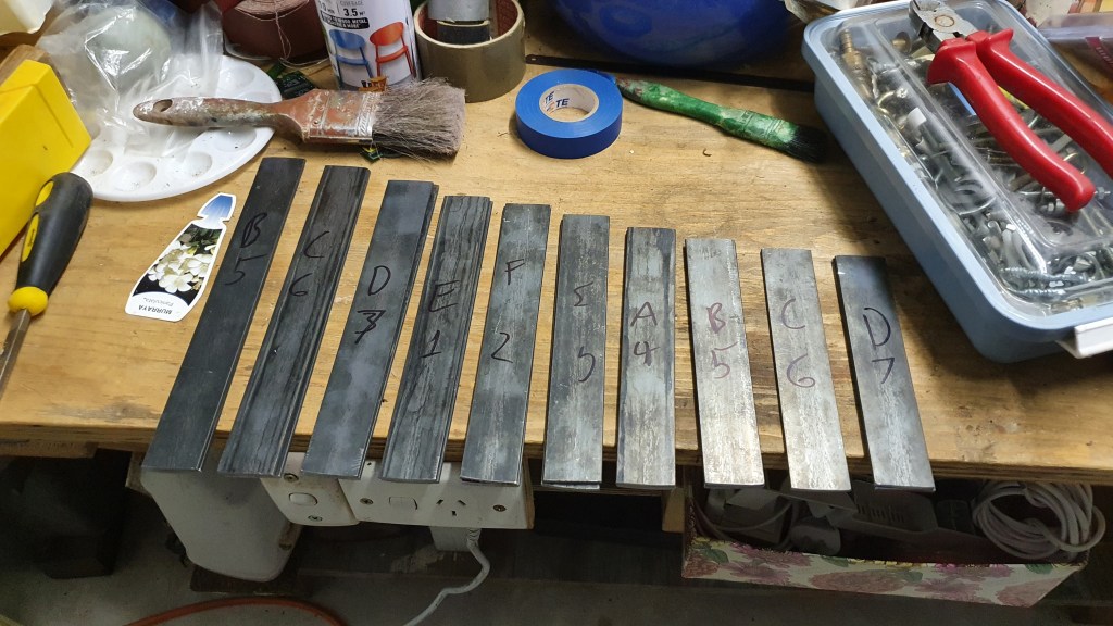 There are in fact sources out there for those who wish to tune the second transverse partial tone to a harmonic interval – see related reading. I found that using plain steel in 35mm*3mm, the second transverse tone sounded very close to seventeen semitones (perfect 11th) above the fundamental – quite acceptable for my purposes. I also think 3mm material might be a little too thin to risk taking weight off the centre.