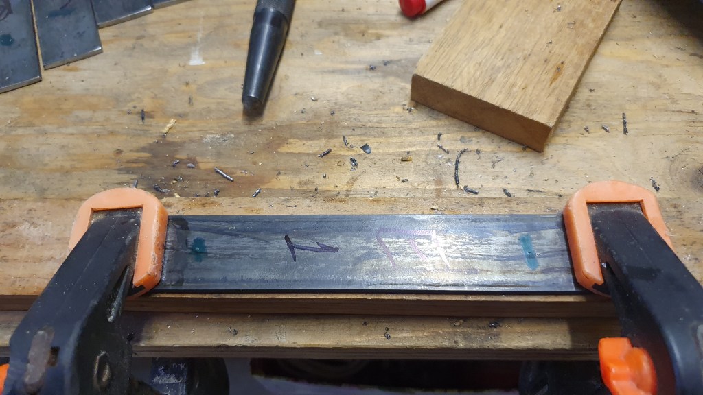 3) Mark this point with a centerpunch and hammer at the centre of the bar’s width, then repeat for the node on the other end of the bar.