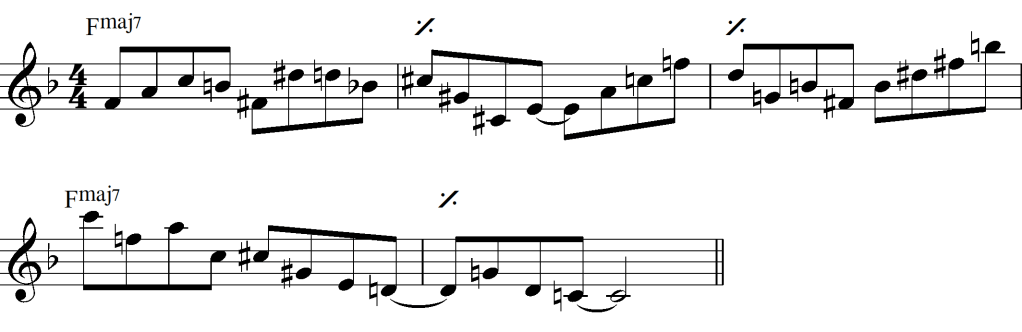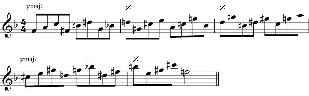 Using your favourite solution, start on your ‘home pitch’ in the chromatic scale and ascend/descend chromatically in through the arpeggios. Here’s an illustrated example using tritone-separated I-ii diatonic triad pairs: